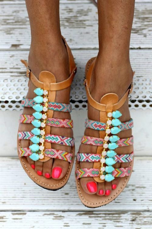 Comfortable stylish sandals will make a spectacular note in your image. Do not forget the femininity. Sandals and sandals decorated with beads, flowers and rhinestones will help create romantic and feminine bows this summer. The absence of high heels does not deprive femininity in such shoes.
