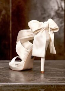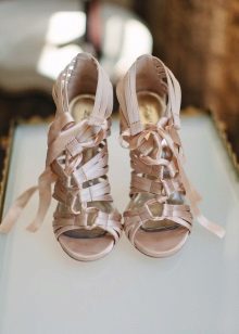 And this is an option for the bride. Delicate color, curly hairpin, lacing in the form of droplets. Dress to such sandals should not be too long, so sandals were visible. The style should be simple, concise, since the emphasis on shoes has already been made.