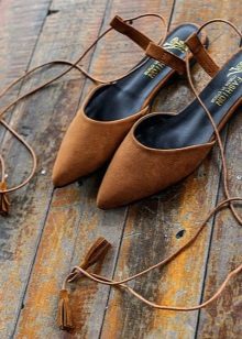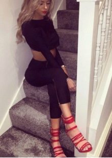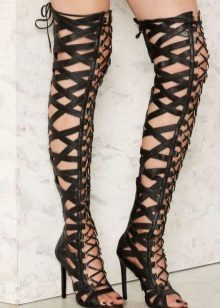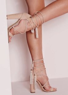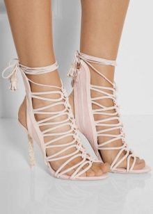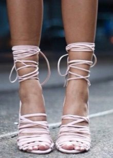 Lace-up sandals are different styles. They can be stiletto, on a steady average heel, on a wedge, on a flat sole. Lacing can be short and long, noticeable and unobtrusive.