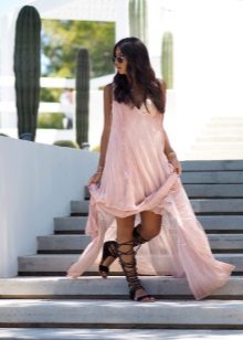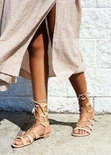 Low-heeled sandals with lacing up to the knees a la Amazon will perfectly suit a short safari dress. A great option for travel and leisure.