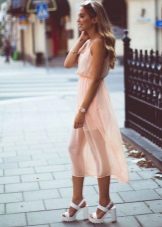 Dresses. For such an image fit any options sandals. Sandals with thick high heels will look spectacular. If you are in a light summer dress, pick up bright sandals. If you are in a strict manner - pick up sandals to match either the classic black color and suede material.