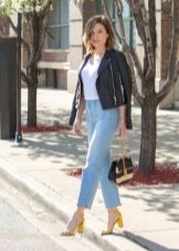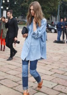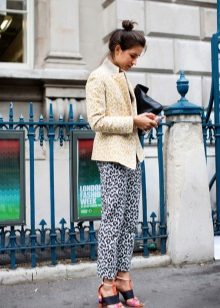 Trousers. Sandals with tight-fitting trousers with ankle-length length look stylish, but there are no limitations in length. From above we combine with a fitted jacket and a blouse. Beautifully with sandals look summer overalls from textiles and lightweight fabrics.