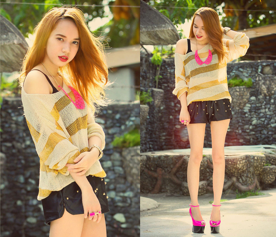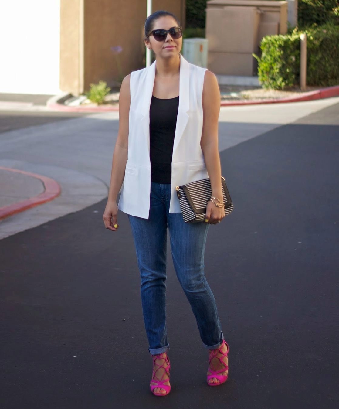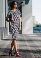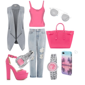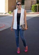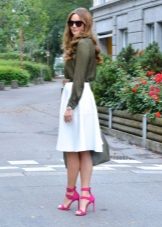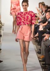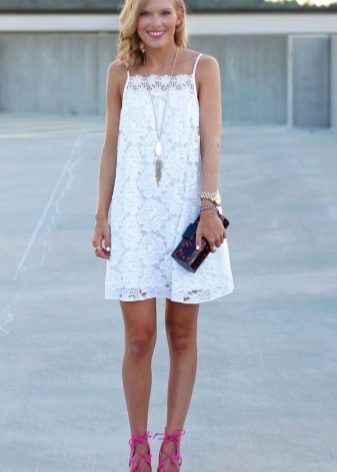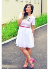 Another catchy youth ensemble. Sandals on a steady heel of rich fuchsia match the shade of lipstick and echo the blouse of a lighter tone. The basis of the dress is a white blouse and pale blue shorts with a narrow strip. An interesting view of the image gives a massive multi-colored jewelry.