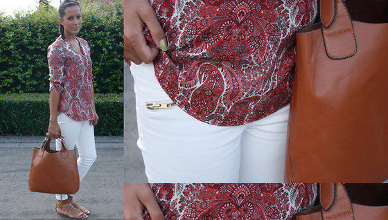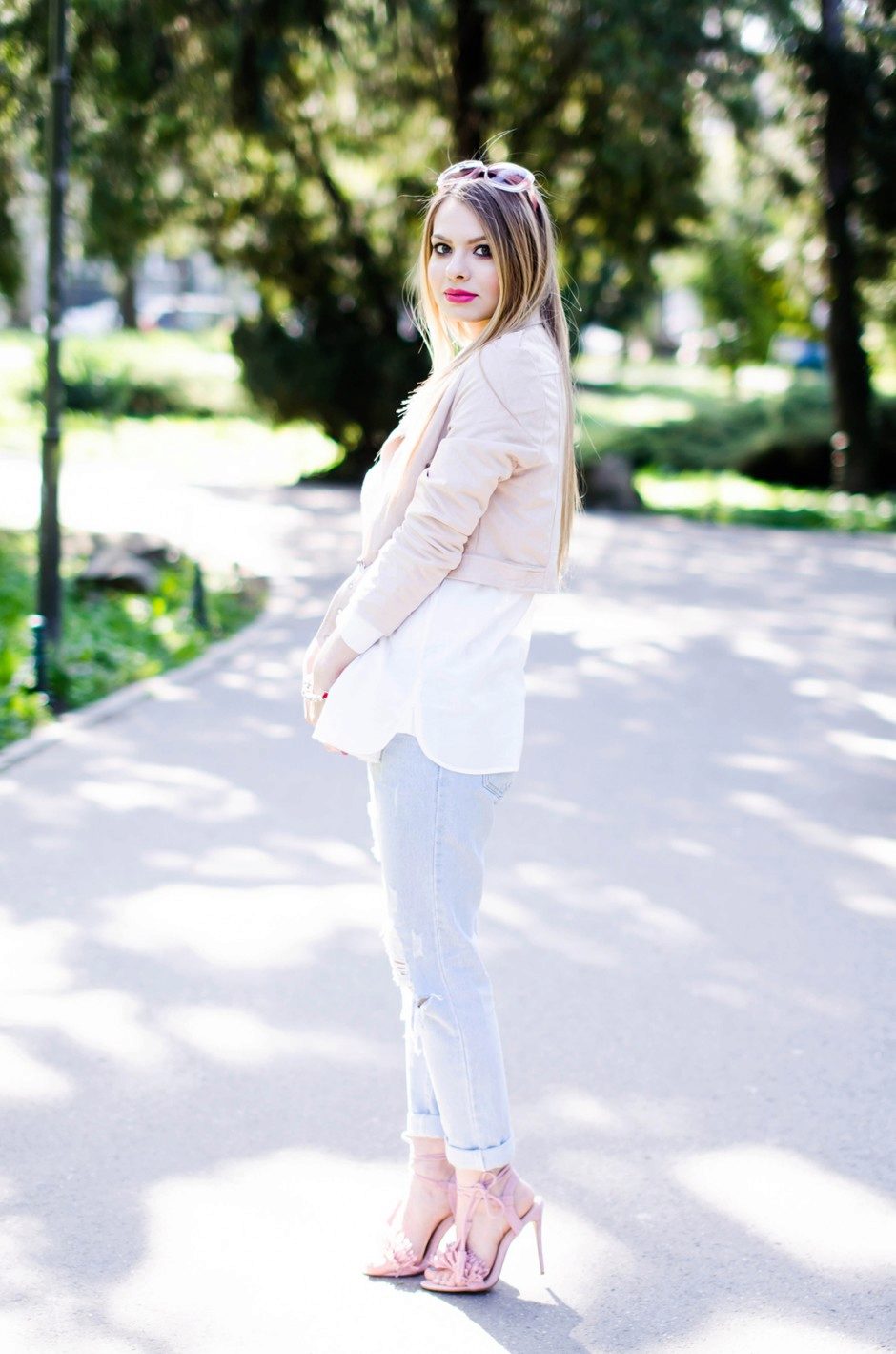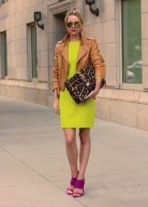 Wonderful casual look for a young girl. A light white dress of feminine silhouette, flared from the waist, perfectly complements the short denim jacket with casually rolled up sleeves. Bright pink sandals on a flat sole are very appropriate to this ensemble (we note that their shade exactly coincides with nail polish) - they act as its bright dominant. The youthful look is completed with a spectacular accessory - a leopard-colored handbag.