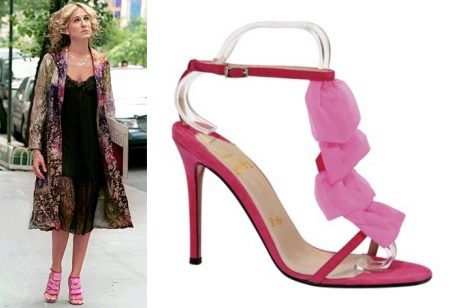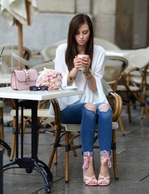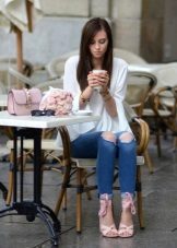 To emphasize the femininity of these sandals, add to the ensemble similar transparent shades: ivory, inconspicuous berry colors, pale yellow, darker pink tones.