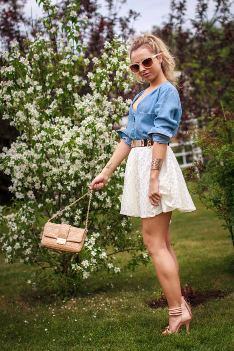 Flared multi-layered mini skirt with a guipure top looks extremely feminine. The metal belt of the color of noble gold emphasizes the waist and corresponds to the texture of a wide openwork bracelet. Denim shirt looks seductive due to the deep neckline, slightly opening the chest. These high-heeled sandals are a perfect complement to this image. Shoes look original thanks to a closed heel with locks and interlacing of many straps on the ankle. A small handbag on a chain coincides in color with sandals. This glamorous image is completed with a girl's hairstyle - deliberately casually picked up curls - and sunglasses of unusual design.