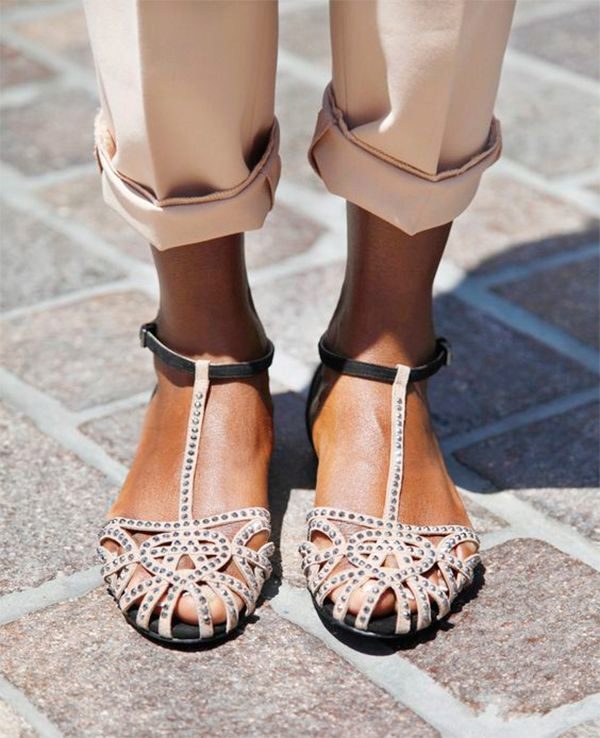 Sandals with a closed nose are both on a flat course, and on the heel or wedge heel. The flat sole is convenient for long walks, the legs in such sandals do not get tired, they are comfortable and quite versatile in terms of compatibility.