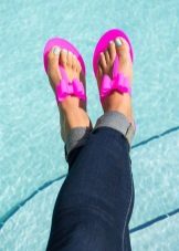 As for jewelry, silicone sandals are perfect for different types of decor. Most often, these are large decorations: bows, hearts, flowers, butterflies, metal decorative elements. Sandals with rhinestones are especially popular. Sparkling crystals are perfect for decorating not only casual sandals, but also more elegant models. These shoes can be worn to a long chiffon dress or skirt, trouser suit, etc.