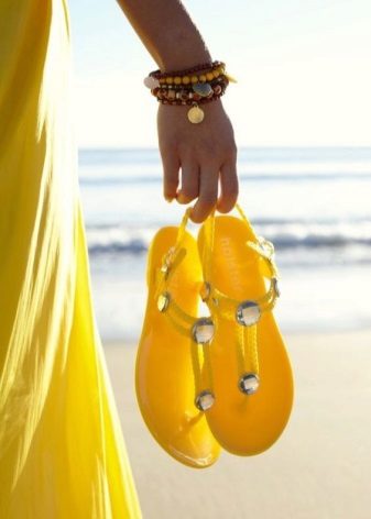 A tunic, a light dress, a jumpsuit, a sundress, a pareo, summer pants, short shorts, capri pants and other clothes are perfectly combined with different models of silicone sandals. Beautifully look ensembles of clothes, made in the same color with sandals. Another option: sandals and accessories, made in the same color scheme. For example, glasses, belt, strap, handbag, jewelry, etc.