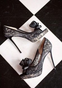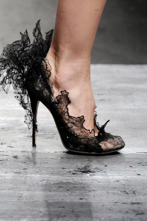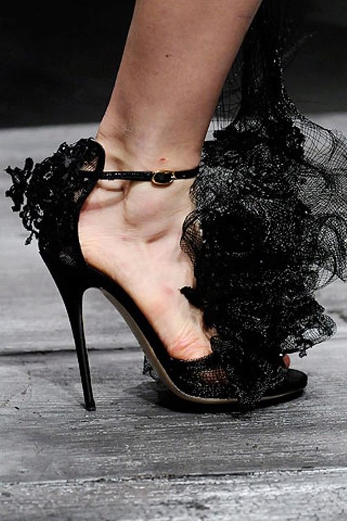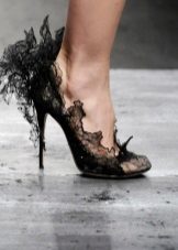Another business card of the Italian Fashion House – sandals trimmed with fine lace. Basically, these are high-heeled models that are often adorned with a large bow.