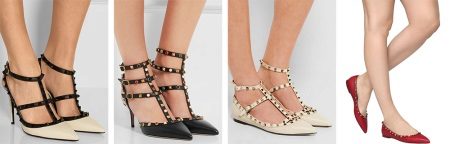 In the assortment of the Italian brand there are espadrilles - Flat sandals with a back. They differ from ballet shoes by open lateral parts which are fixed by thongs. The straps also wrap the leg over the ankle. This model of sandals is traditionally decorated with spikes.