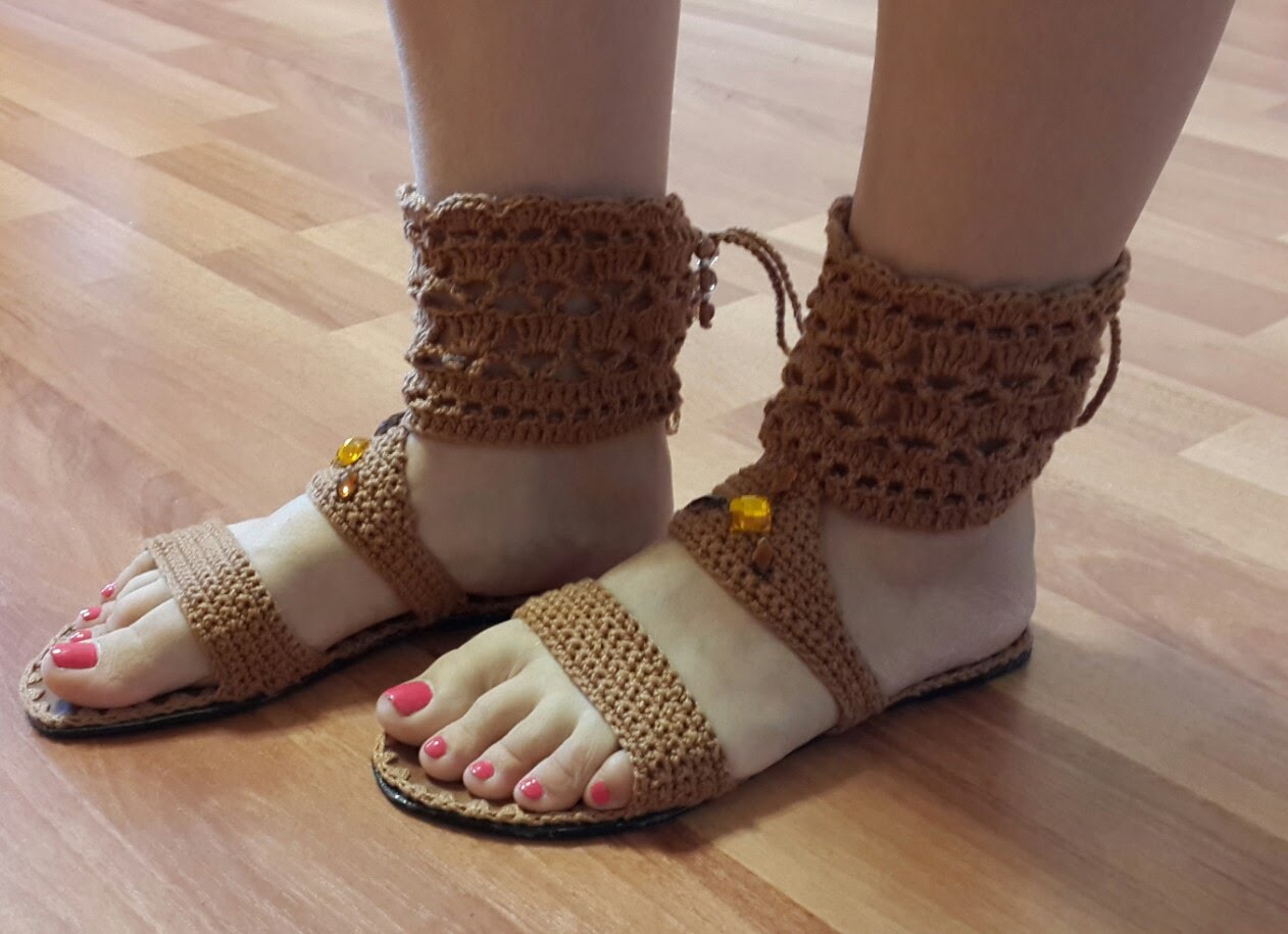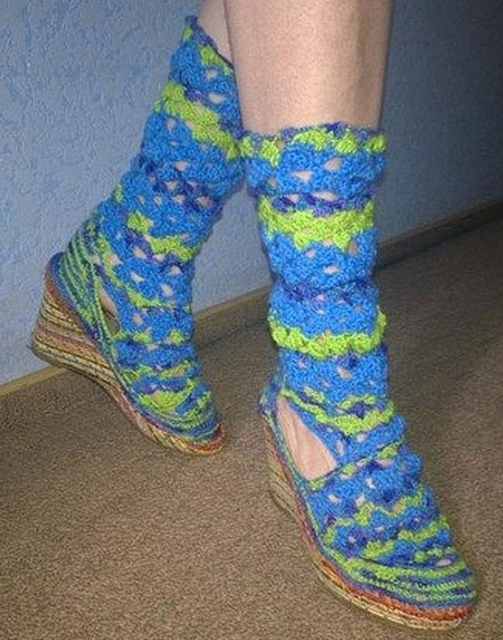 Original look knitted gladiators - high sandals on a flat sole with bindings (or heels), which can reach the knee.