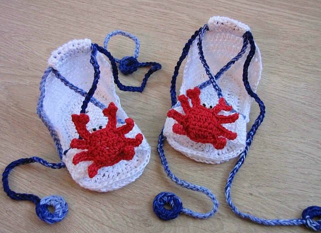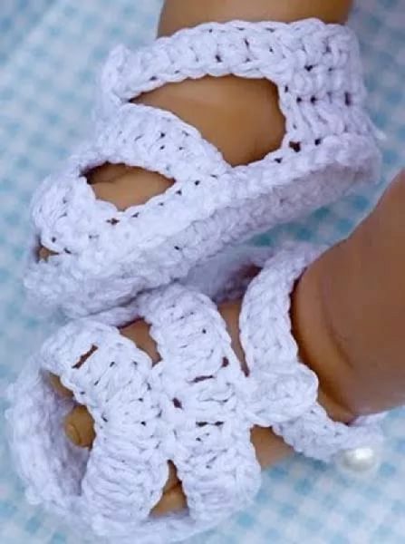 Charming crocheted booties in the form of sandals, designed for very little girls.