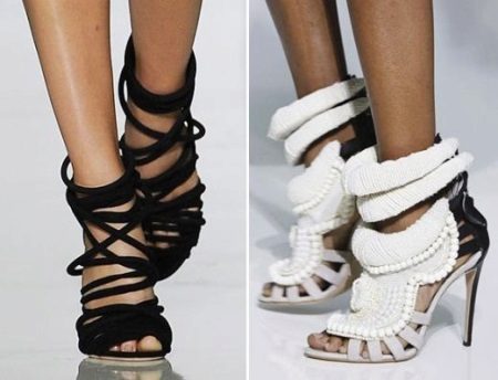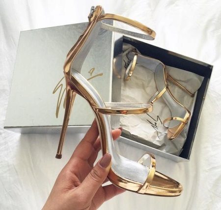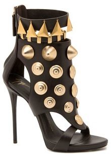 Not only designers, but also world stars are working on some models. one of them is Kanye West. He created three pairs of sandals for Giuseppe Zanotti Design. In 2012, he and the brand presented two completely different models on high heels. The first, made in white, was decorated with pearls, and the second consisted of many suede buckles in the form of weaving. A year later, another collaboration was released - the Cruel Summer model, made in golden black and white.