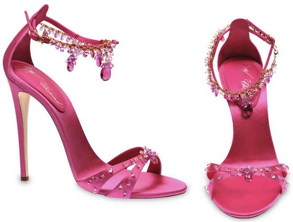 Together with Chopard, Giuseppe Zanotti Design represents the world's most expensive pair of shoes. Open sandals made of satin, which adorned diamonds, pink sapphires, rubellites and gold thread. They were sold at a charity auction for 200 thousand dollars.