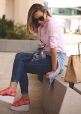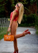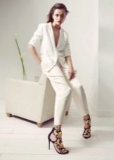 Sandals and pants. For a walk, you can choose corrugated trousers or pipes that will transform the image and hide the flaws, but sandals on stilettos are used as shoes, to complete the image you should choose a shortened jacket.