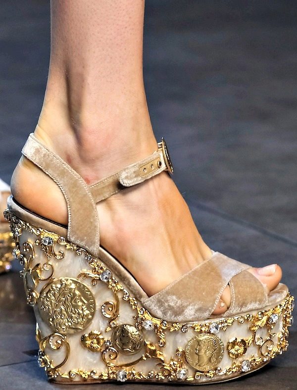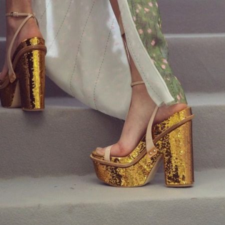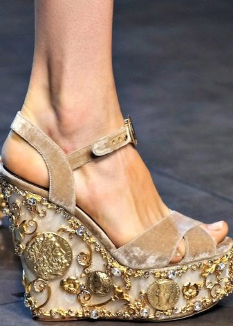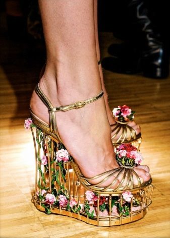 Such models are very stable, and at the same time, are able to give their owner a few extra centimeters of growth. The wedge may look like a regular sole, for example, cork, or it may be hidden, covered with the same “golden” material as the entire product.