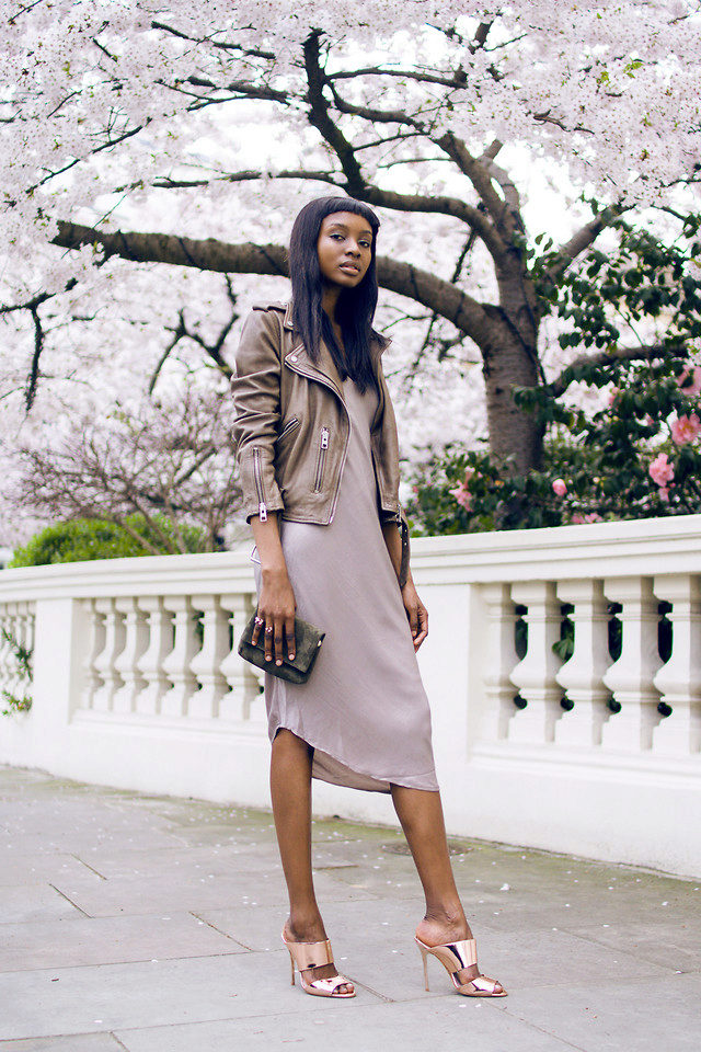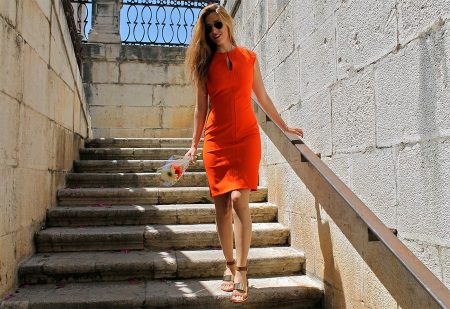 An ensemble of bright orange dress, golden clutch and golden sandals will look pretty impressive.