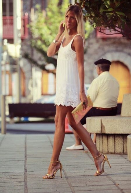 Here, golden sandals do not attract the main attention to themselves, they rather complete and harmonize the overall impression of the composed ensemble.