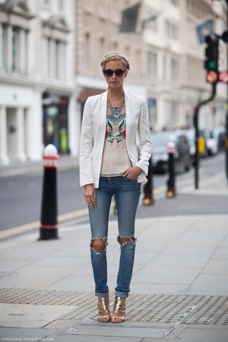 Also, a casual ensemble may consist of a pair of narrow jeans, a sandy-colored top, decorated with sequins and a pair of golden sandals with heels.