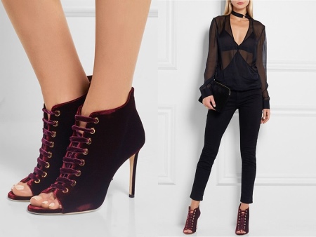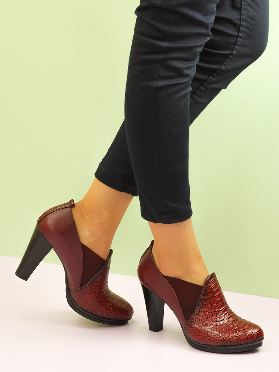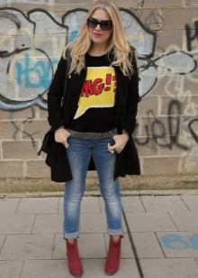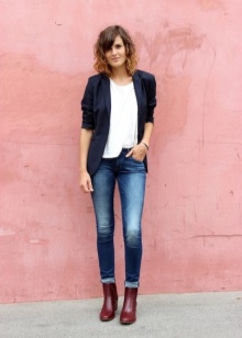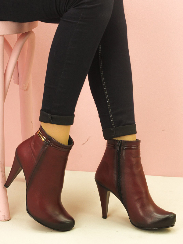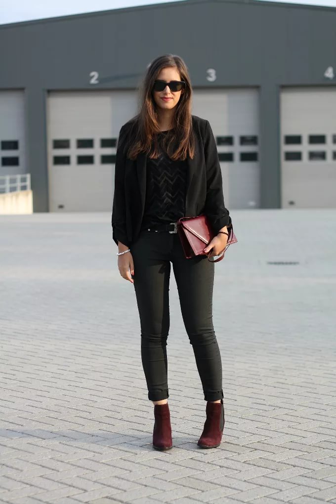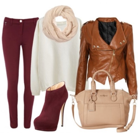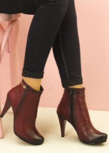 Maroon ankle boots made of genuine leather with high heels in a tandem with a black leather jacket will add this rough, but incredibly stylish piece of clothing sophistication. To help the color scheme will help a blouse with a wine color.