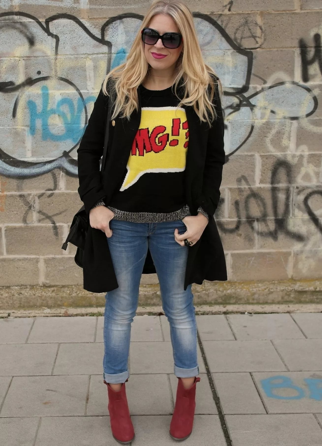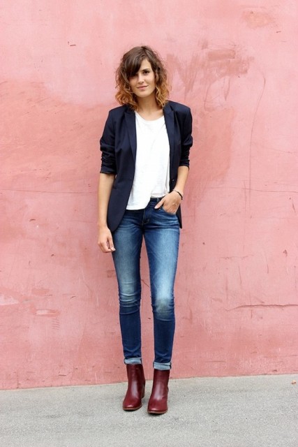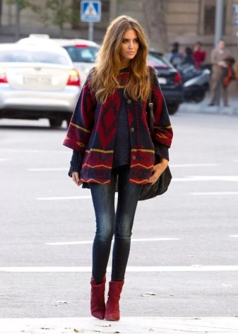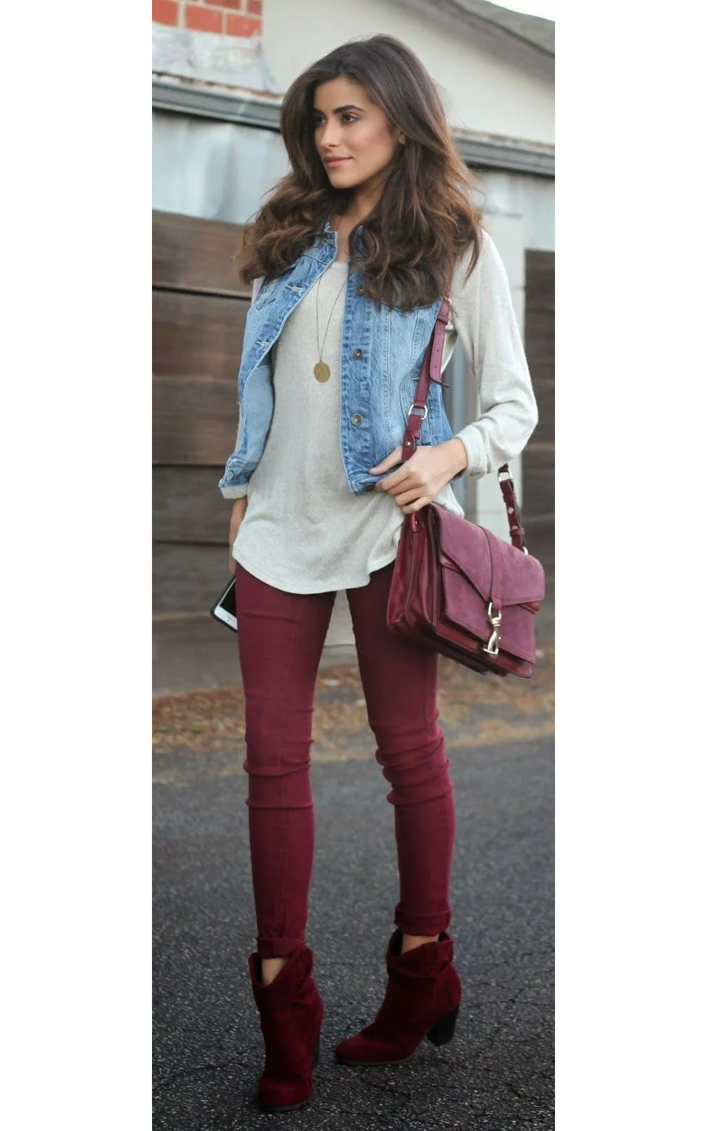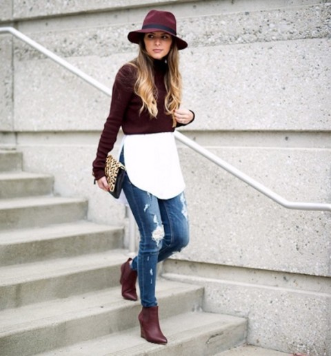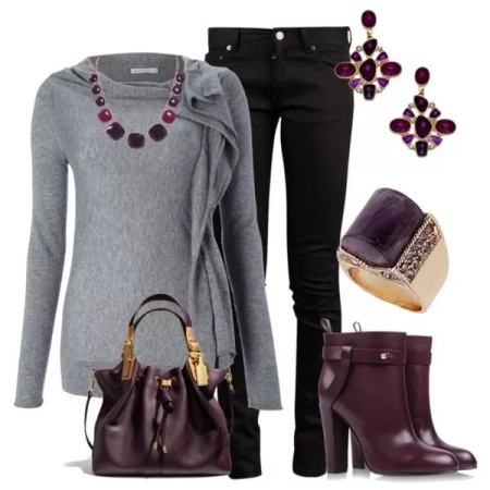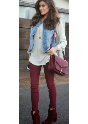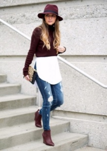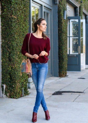 An image with burgundy ankle boots will look very stylish if you use two colors close to each other in clothes (for example, gray and white, sand and orange), and the color of your shoes is supported by wine shades with accessories.