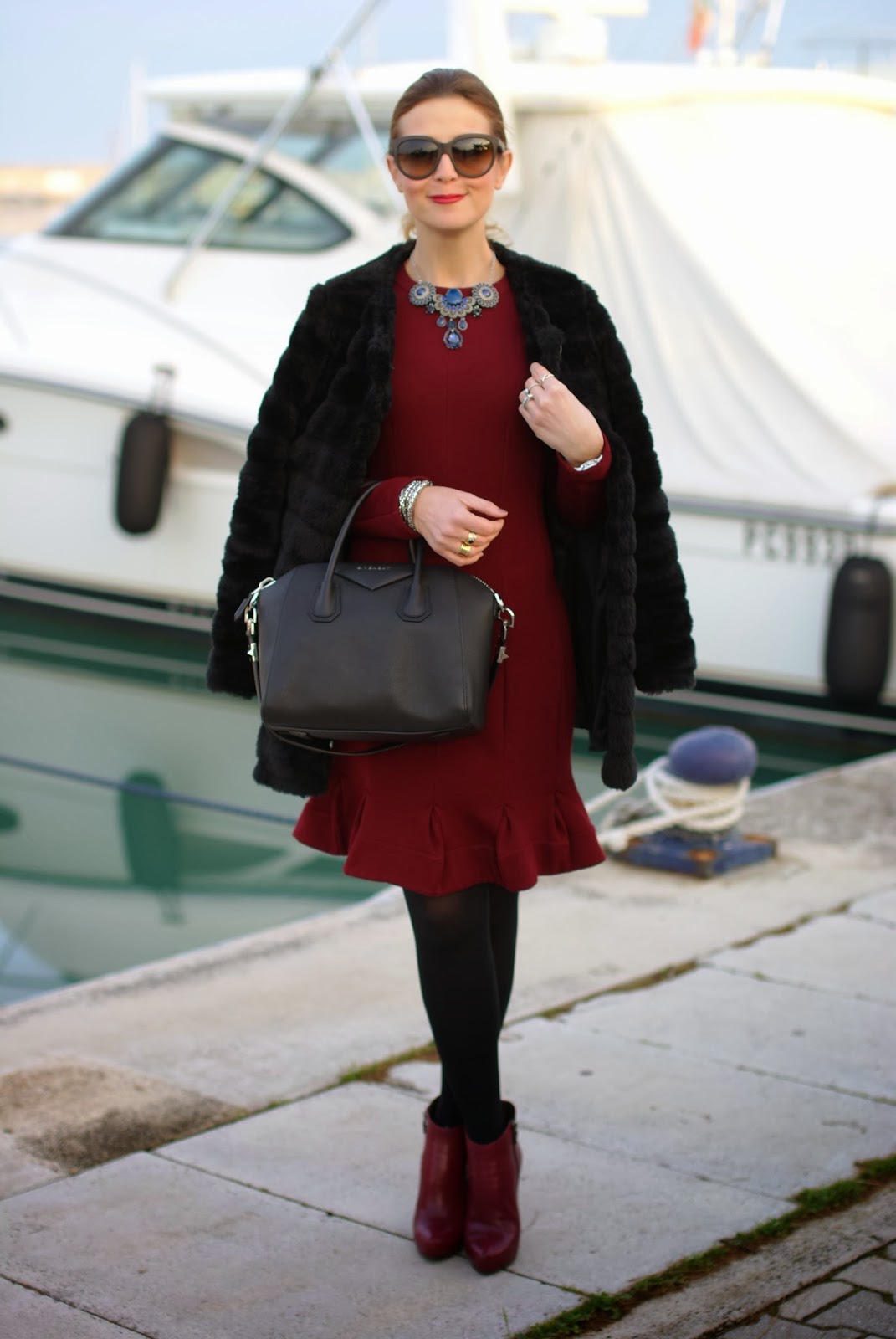 When another bright color is present in the image with burgundy boots, red or emerald green, the third color should be in harmony with both shades and represent something neutral, restrained.