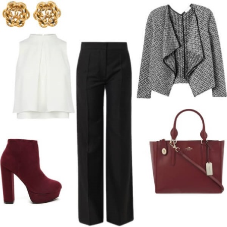 Burgundy shoes, supported by a bag of the same color, perfectly fit into the image in a business style. The combination of light texture and free forms of top, straight trousers and cardigan requires a bright accent, which will make the image unforgettable. Being a bold color, the shade of burgundy, beaten with clear shapes of bags and ankle boots, will add a bold touch to the business set. In addition, thanks to a thick steady heel, ankle boots are quite comfortable even for women whose work is not limited to the office desk.