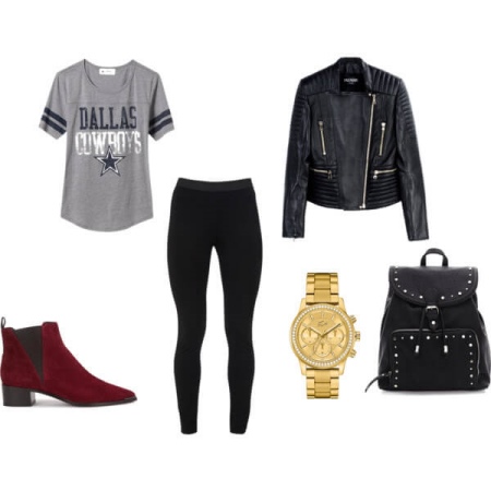 A bold youth look with a leather jacket decorated with rivets will complement suede booties with a flat sole. They are comfortable and, in tandem with a jacket, are capable of turning a combination of a free jersey and black leggings, typical of a sporty style, into a fashionable look for every day. It would be appropriate to use a gold-decorated watch in such a set - this bright and convenient accessory will not only look organically combined with black and burgundy, but also bring many benefits to its owner.
