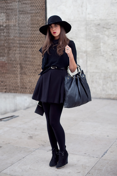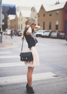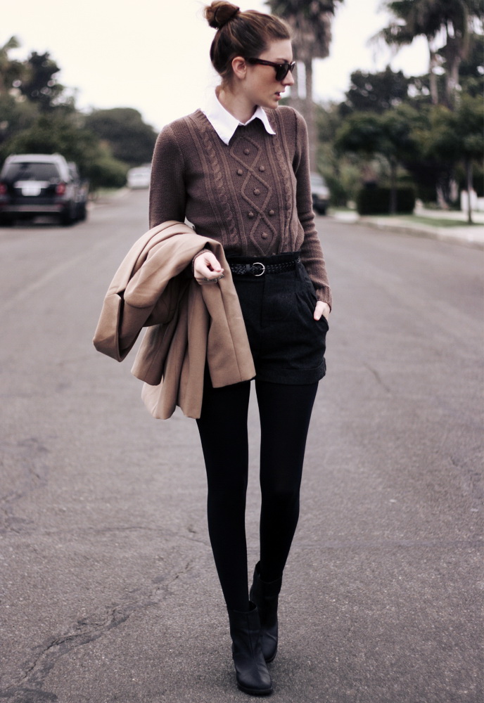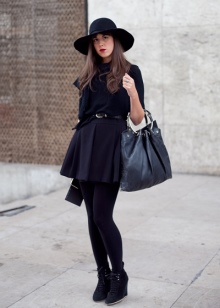 Shorts are also appropriate in a feminine image with black ankle boots. The main thing to remember is that beige capron tights will not fit into such an ensemble. Tweed shorts should be worn with black opaque tights, and denim shorts are suitable for the warm season and are worn without tights.
