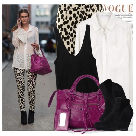 Trendy trousers with a print, which will be the main focus of the image, are perfect for neutral black boots. Top to this side should choose a more voluminous. Look good with loose elongated blouses with black edging or oversized sweaters.