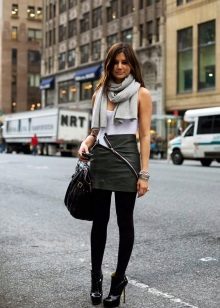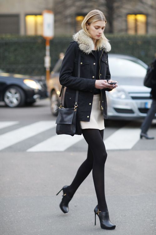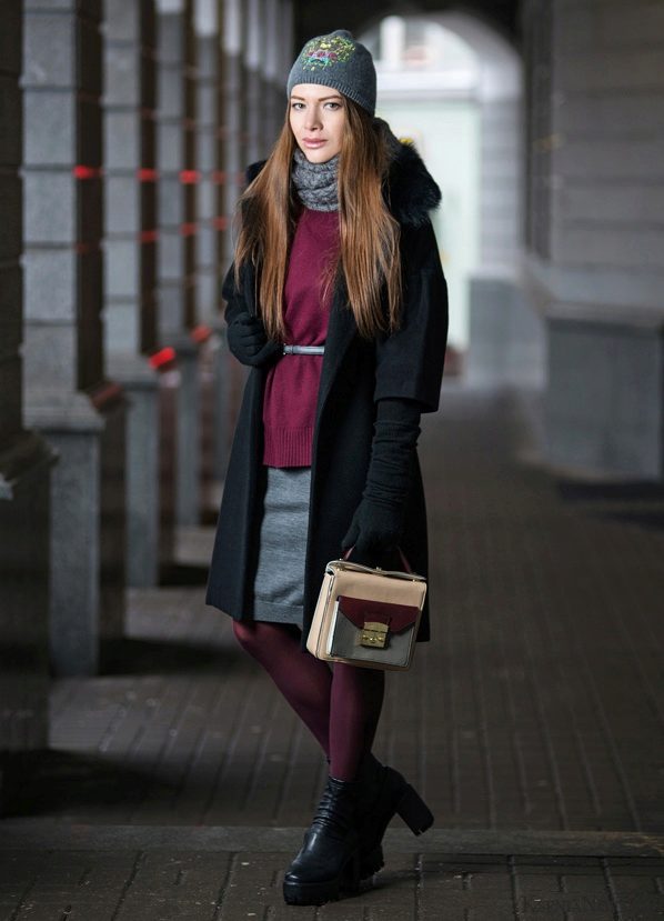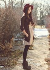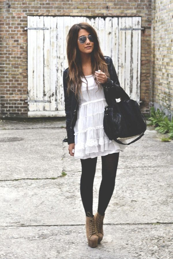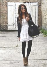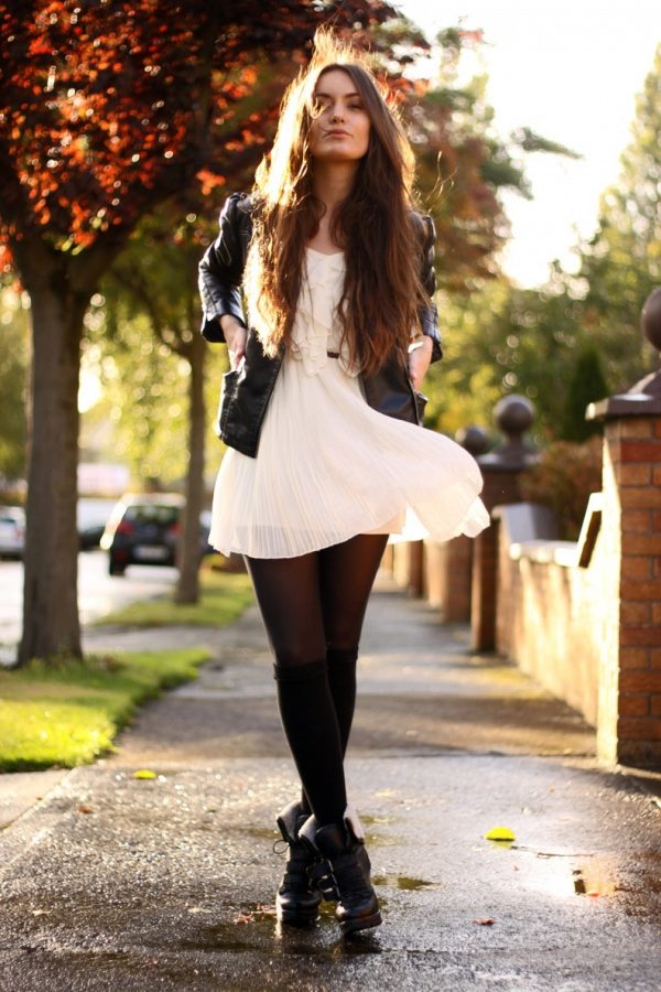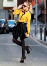Shoes with open toe looks interesting with tight tights. For the most original and courageous personalities, bright tights will be the perfect solution. For an evening look, it is better to wear thin tights with any effects or decorations. Lace leggings will be an interesting option. Choose clothes that have a variety of draperies, ruffles and ruffles, asymmetry and uneven clothing edge.