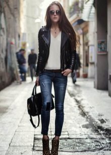 If you want a looser bow, look for a patterned jacquard knit jacket or pullover and jeans. The image can be supplemented with a voluminous leather or linen bag.