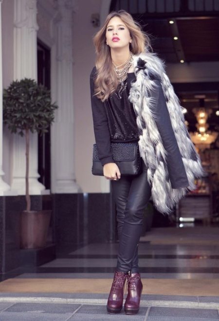 If you want to go to a party, pay attention to the bright, patent leather ankle boots. They can choose a silk dress or a fur vest of the same color. If you decide to wear a fashionable shiny dress, then ankle boots are better to choose neutral, black.