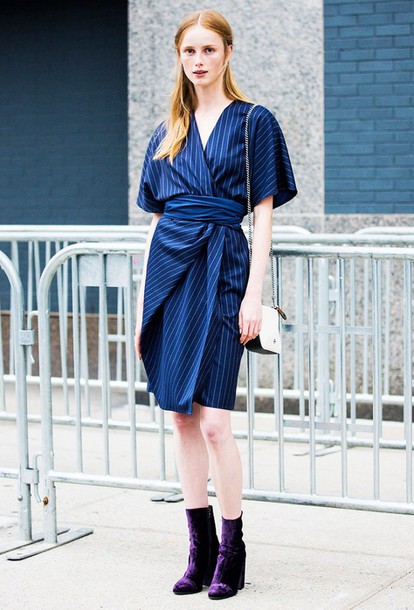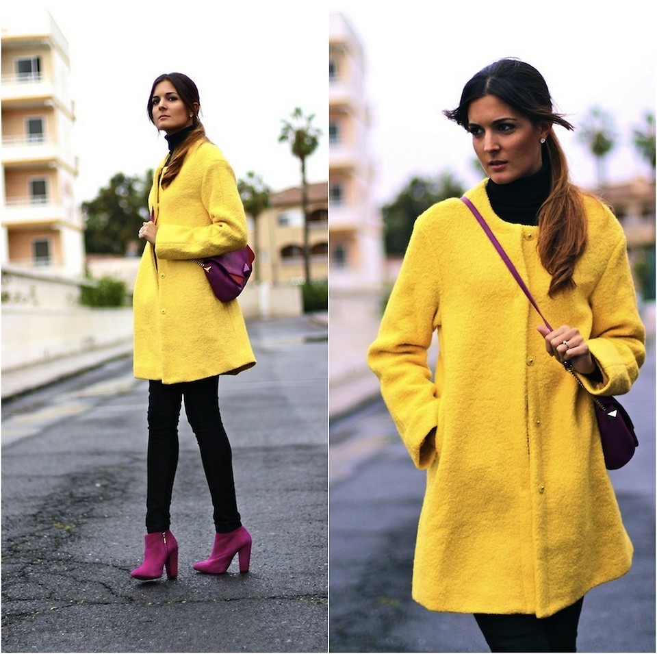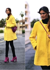 Dark jeans and purple ankle boots are the most common combination. With these things you can wear sweaters of rich mustard shades, and in the cold season to use in a set of jackets of yellow and blue colors.