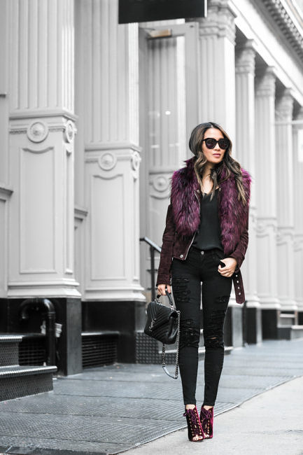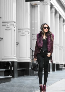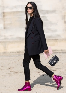 - To match the office dress code, but at the same time look feminine, just wear a purple blouse made of silk fabric, suede ankle boots of the same color with black narrow pants and jacket, and choose a handbag to match.