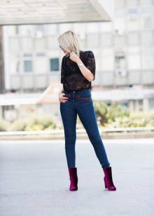 - White clothes with ankle boots are well suited for brunettes, and blondes will make the outfit even paler. In combination with purple shoes look great jeans milky.