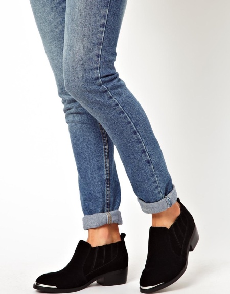 Ankle boots with low heels visually shorten the leg, so these shoes look best with jeans or pants, especially tight-fitting. Then the leg will visually appear longer and slimmer, and the whole silhouette as a whole will stretch.