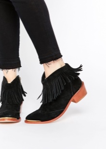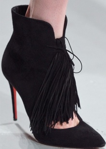 The trendy decor of the season is distinguished by creativity and a flight of fancy. Ankle boots are decorated with thin straps, decorative stitching, metal studs, buckles, zippers, and lacing with leather flounces. Winter trends were aristocratic couples with fur edging. Graceful options for autumn are generously decorated with fringe, located in several rows.