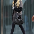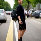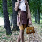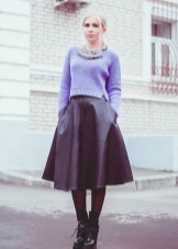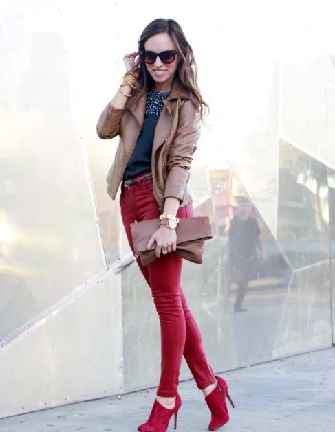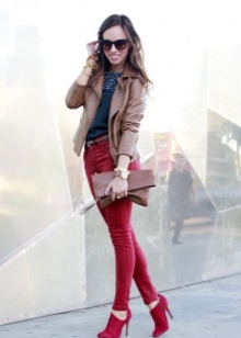 Classic bow in dark shades, consisting of a black jacket, tunic and short trousers, will help to dilute the raspberry boots. If the heel of the shoes is square, and the texture is shiny - the image will be bright and spectacular. You can add it to a small bag with a chain.