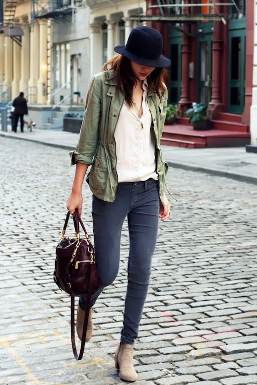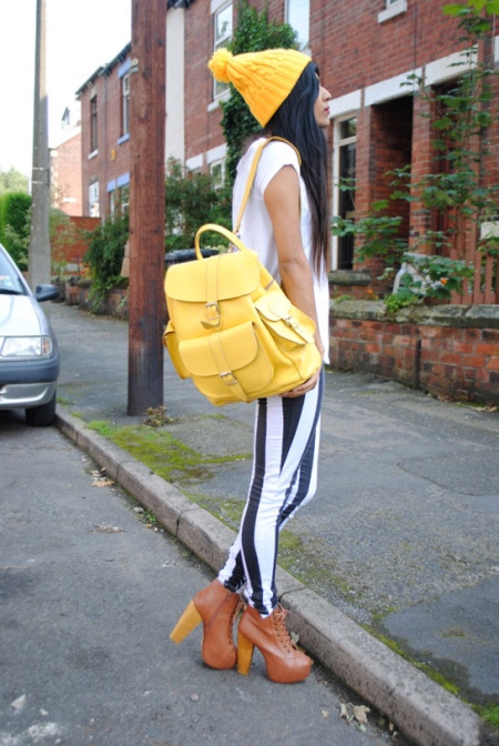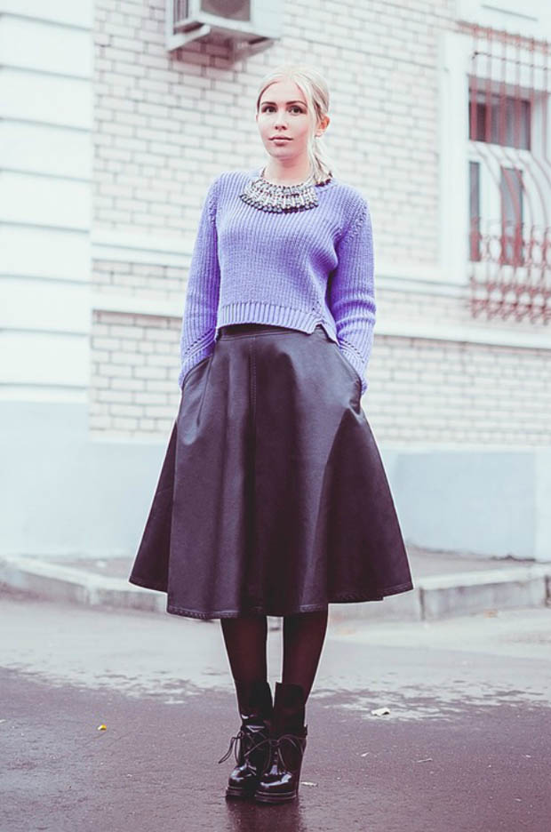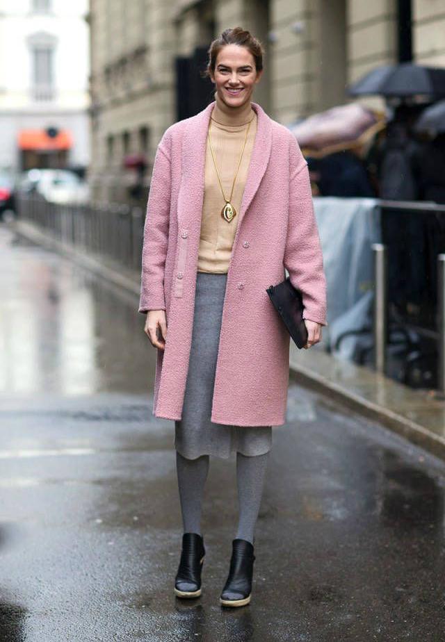 Mint and candy shades can perfectly dilute the dull autumn. Shoes on the platform can be the same tone with a jumper. Light coral jeans and a sand-colored down jacket are perfect for them. A small cream-colored handbag will be a harmonious accessory.