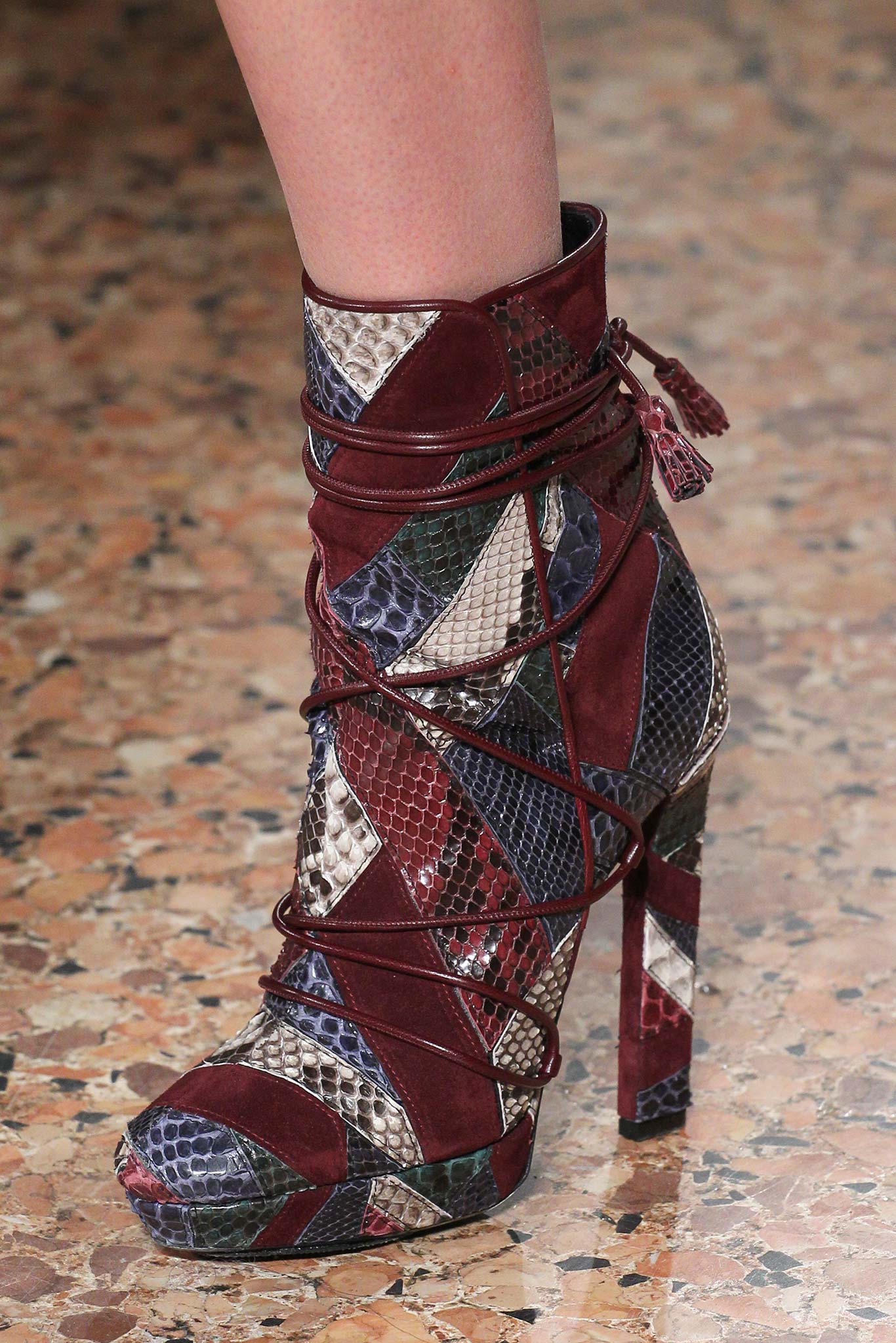 The choice of material depends on the time of year. For the off season, natural or artificial leather, suede, nubuck and velor are commonly used. Often models are warmed and decorated with fur.