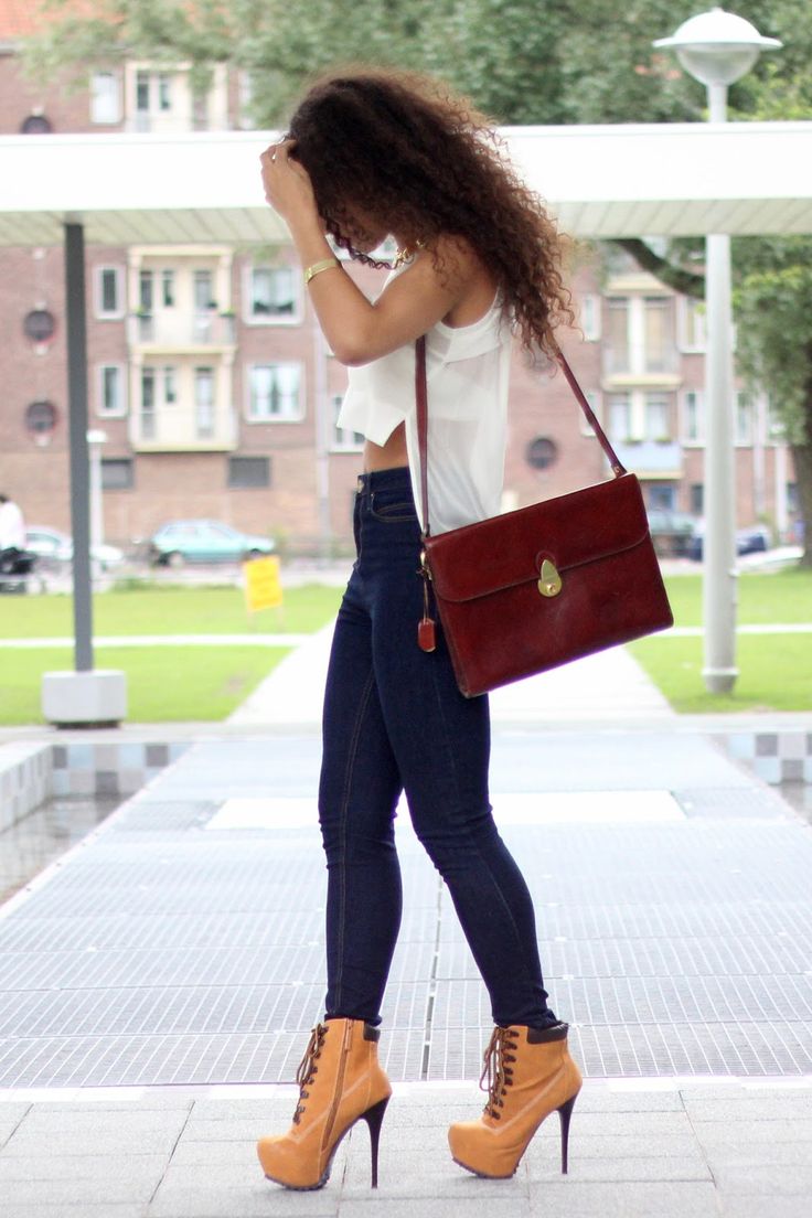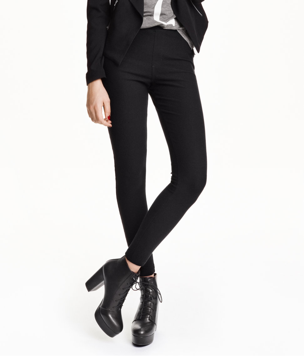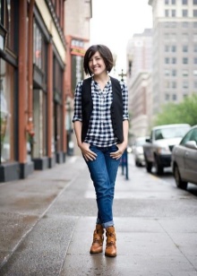 Jeans, jeggings, leggings and other tight-fitting models of trousers will be the best option for any length of legs and almost any shape. Fit-fitting trousers with ankle boots on a wedge heel and high heels with lacing look great.