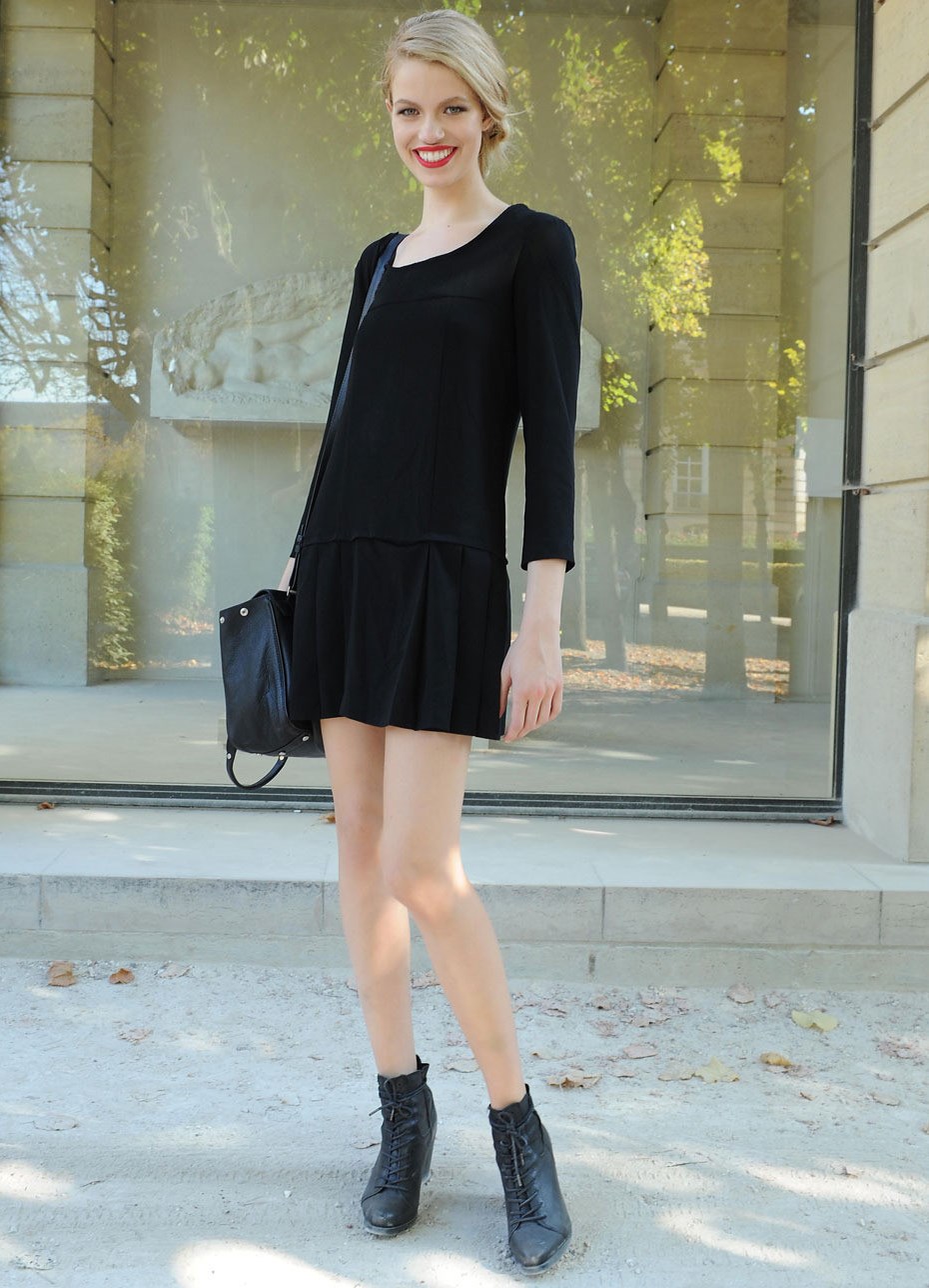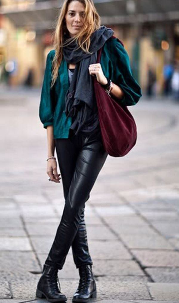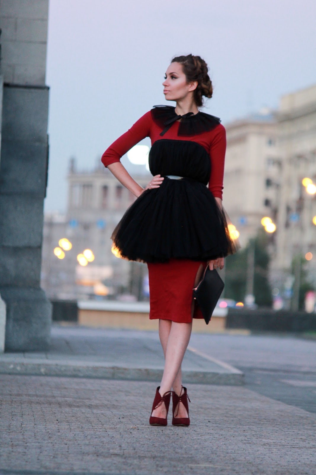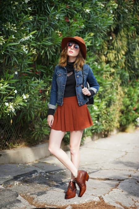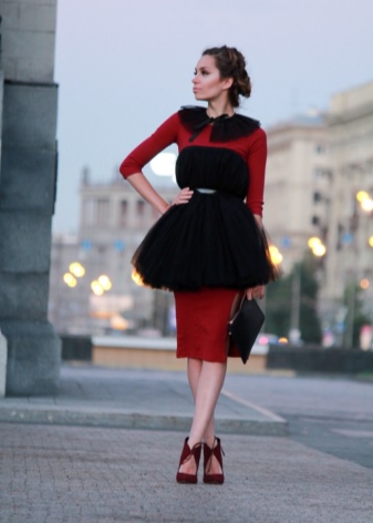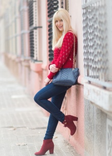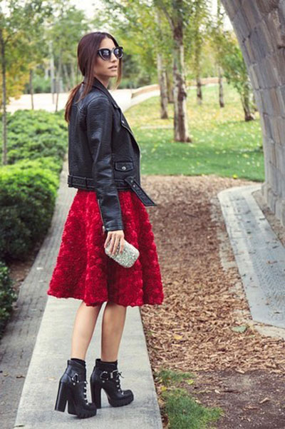 Almost a rocker look, consisting of leather leather jackets, fluffy bright red skirt just below the knee and original overpriced ankle boots with thick high heels, with lacing and a cool large buckle. An outfit for bold and extravagant women. Of course, the director is unlikely to understand you if you come to work in this way. Look for freedom-loving bright personalities who are alien to restrictions and rules.