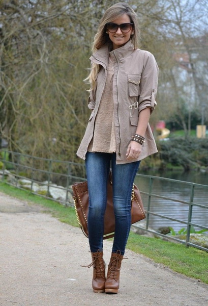 A classic combination of black leather ankle boots with laces on the tractor soles with slinky dark blue jeans. A very concise and restrained image is emphasized by a classic fitted coat with original accents on the sleeves, in the form of a zipper.