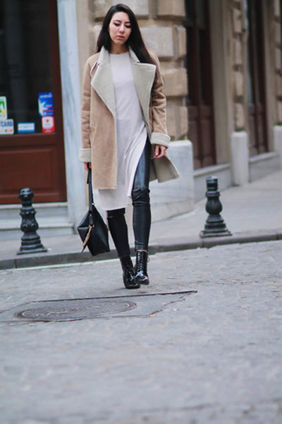 Gentle image for romantic natures. Despite the bulkiness of the soles of the boots of a light brown color, they are perfectly combined with a light chiffon dress with a pleated cream-colored skirt. The scarf-snud wrapped around the neck is in harmony with the coloring of the shoe and is in the same color scheme with the dress.