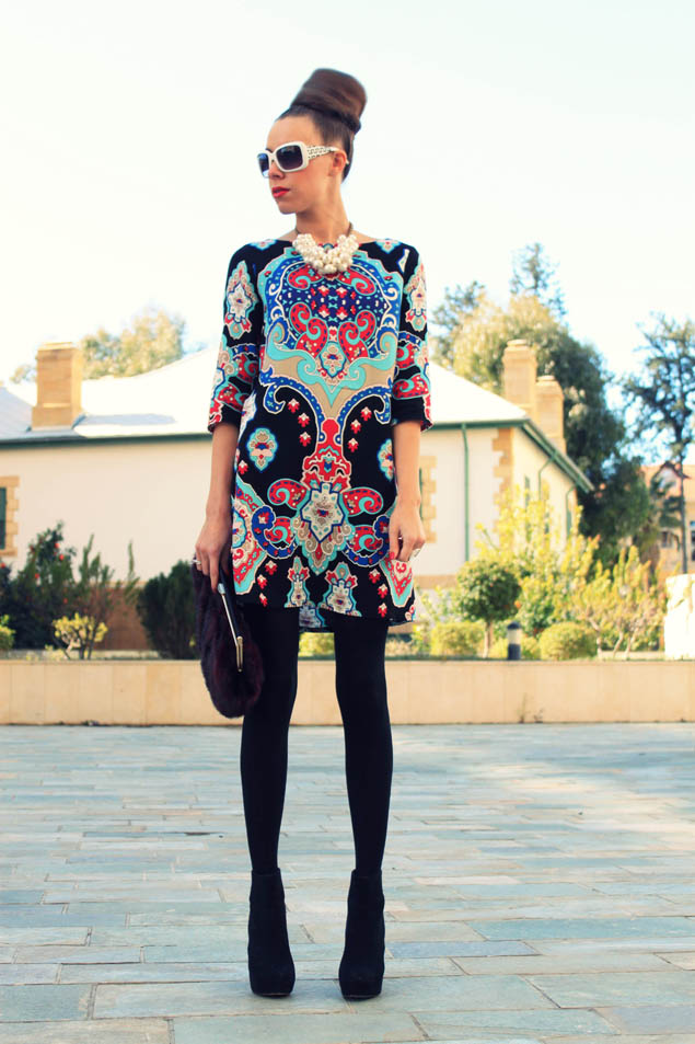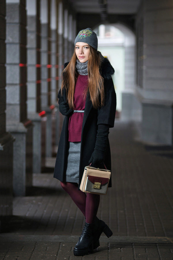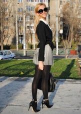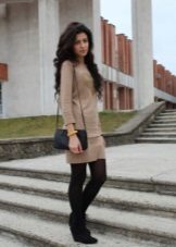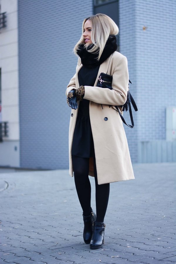 Classic black ankle boots will help you create an elegant business look. Black short dress and black thick tights are diluted with a beige knee-length coat. A black scarf and gloves with a leopard print will not allow to freeze.