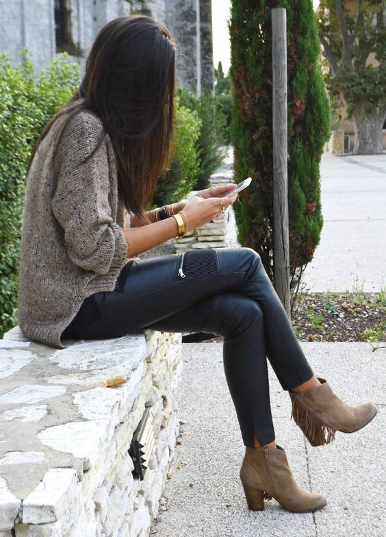 Autumn olive ankle boots in thick heels with a fringe are perfectly combined with leather black leggings and a multi-layered top: a light black blouse under a gray sweater. Many gold bracelets dilute the image with color.