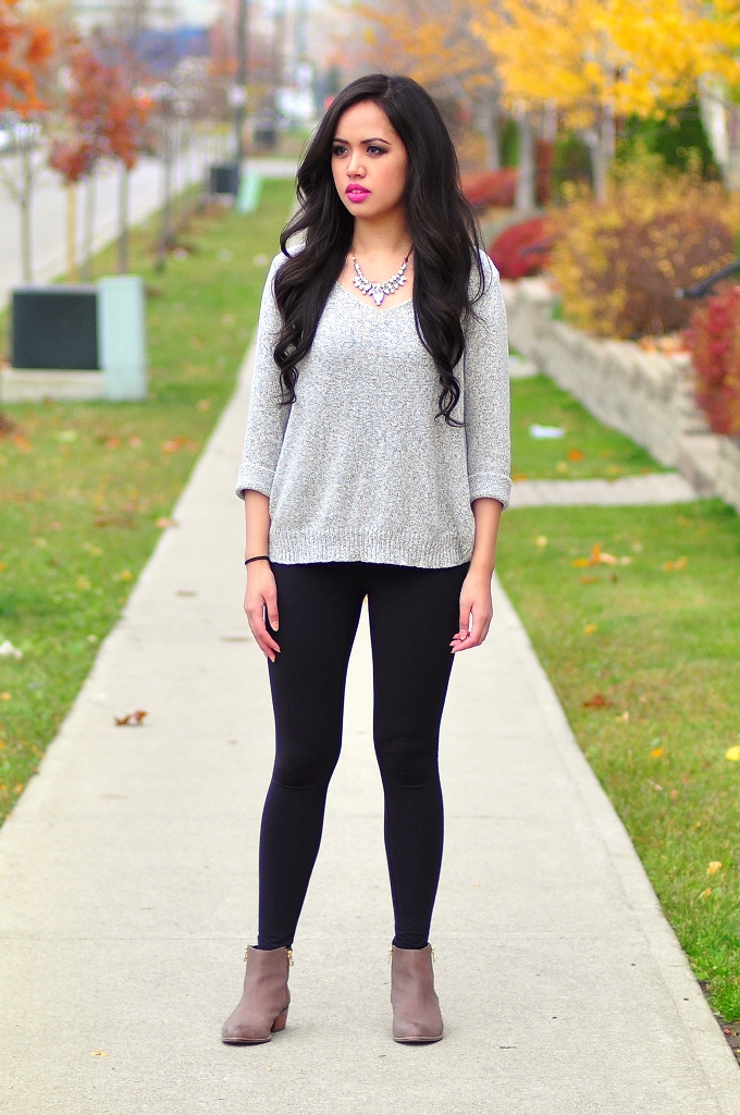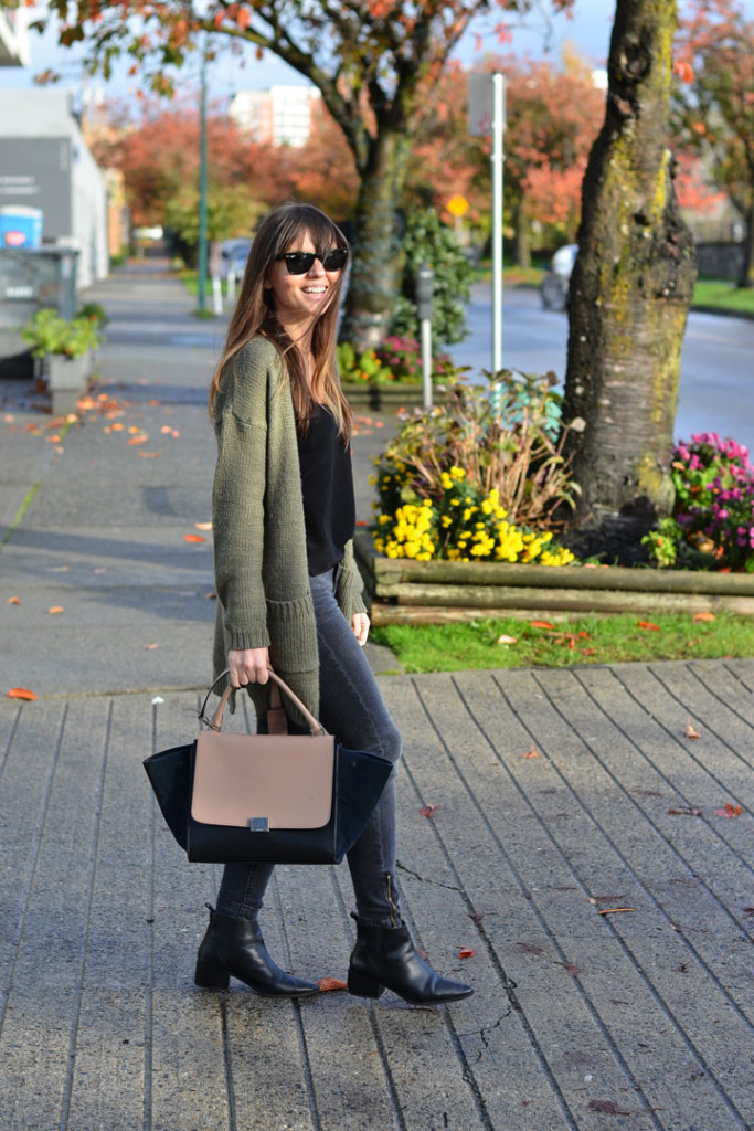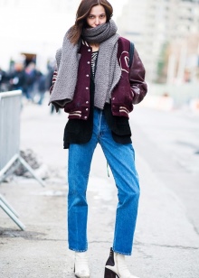 An urban autumn casual can be striking if you wear a red pullover with deep pockets. A scarf-snood, a hat and ankle boots on a low, wide heel with laces bring dynamics and sexuality to the bow.