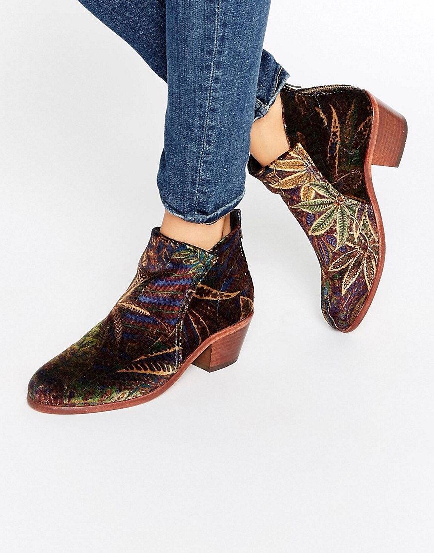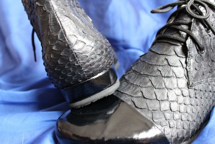 Unusual printed models under the skin of python. In such designs, the material becomes an accent of the pair: leather lacquer, sparkling satin and malachite textile ankle boots prints themselves are the decoration of products.